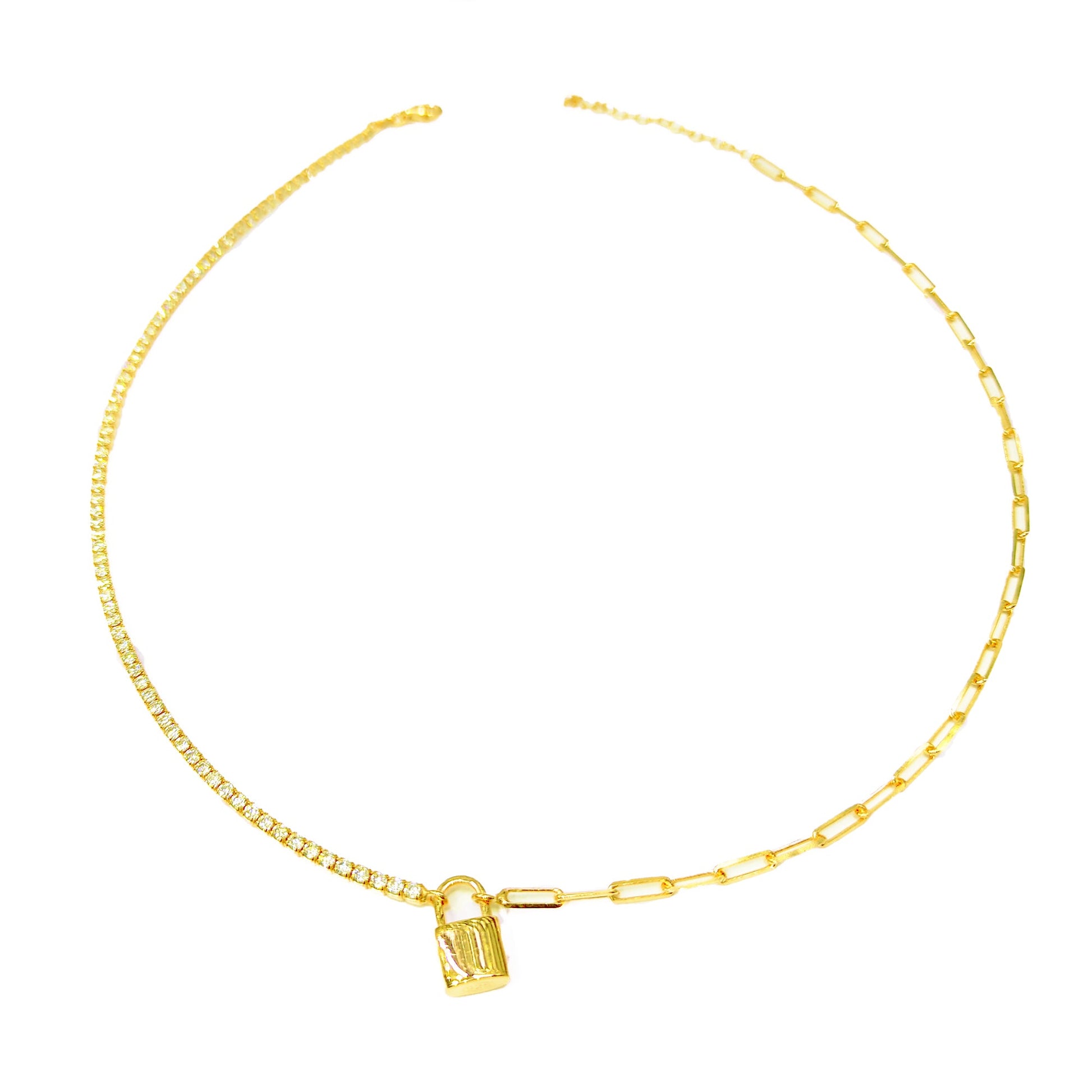 Half Tennis Half Italian Chain Lock Silver Choker Necklace