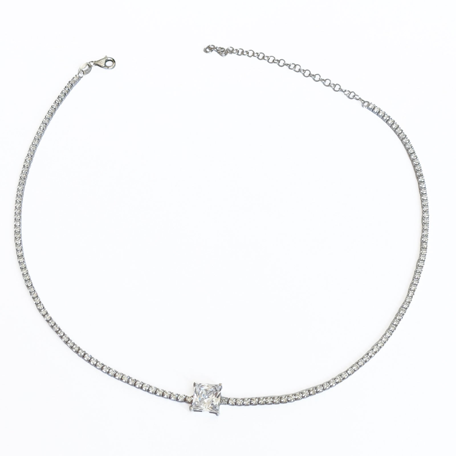 Square Stone 2 mm Tennis Chain Sterling Silver Necklace, Tennis Choker